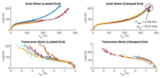 Figure 16 shows strain–load curves for these specimens. The results show that these skin/stringer panels can be strained up to 400% before ultimate failure is reached. Furthermore, it was observed during the test (Figure 17) that these structures fail between stringers. However, it is important to note that the damage propagates very slowly and that it takes a significant amount of energy from the point where damage starts to be observed to the point where the structure catastrophically fail. These results are very positive due to two main reasons: (a) the FishBAC’s skin is pre-stretched by 15% and will see roughly another 10% strain during operation, and so the required strains are very far from failure and (b) any cracks or surface damage on the skin should not lead to catastrophic failure at these strain levels. Therefore, the two-phase skin/stringer panels were deemed safe to use in this wind tunnel experiment.