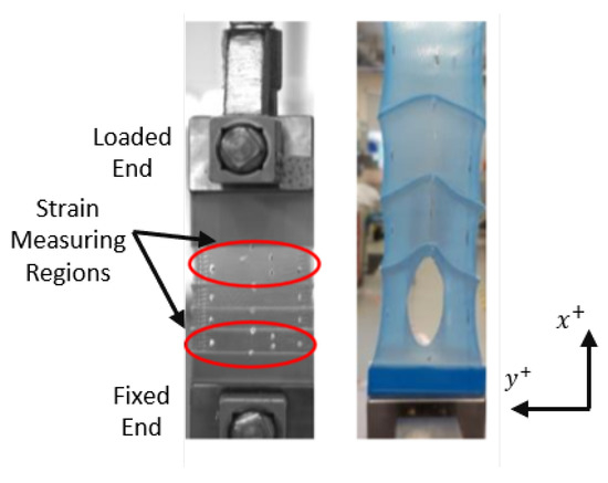 An Imetrum Video Gauge point tracking optical system was placed perpendicular to the test specimens to measure in-plane strains. In this test, strains were measured in two different regions: (i) between the fixed end of the specimen and the first stringer, and (ii) between the loaded end and the third stringer.