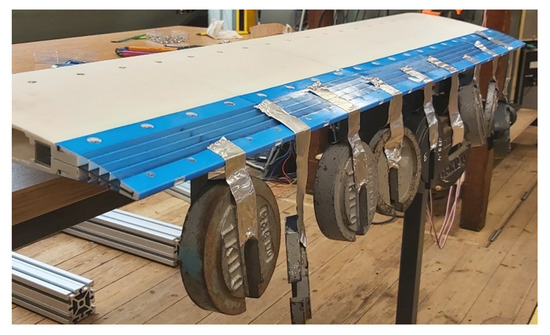 The robustness of the FishBAC was verified by performing a benchtop mechanical loading test. The structure was loaded discretely using point masses. A total of in hanging masses (i.e., at each 200 mm along the span) were attached to the FishBAC (Figure 18). This loading was selected based on the maximum root bending moment that the FishBAC will experience at the test speed of 30 m s−1, at its maximum camber deflection and highest expected lift coefficient, with a factor of safety of . Additionally, the FishBAC was actuated to its maximum upper and lower deflections while the weights were still in-place, to verify the device’s structural robustness. Since the structure successfully resisted this proof load test, the devices were said to be safe for wind tunnel testing at 30 m s−1.
