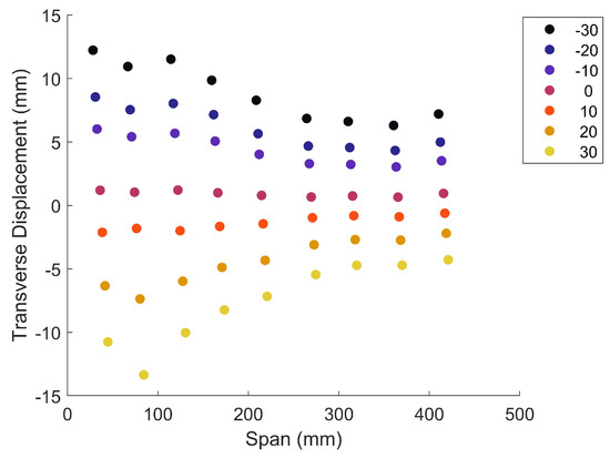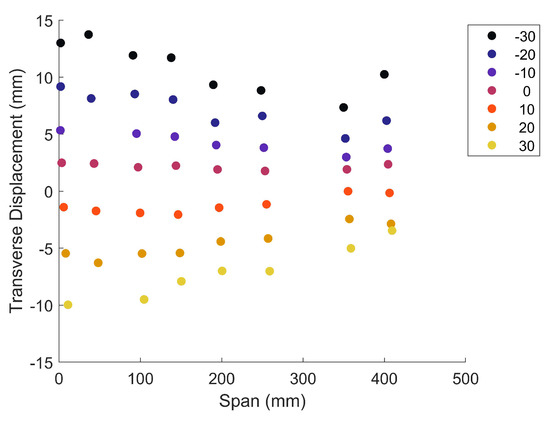 The point tracking system tracks the position and displacement of each target point. Figure 19 shows the transverse displacement at the spanwise edge in the absence of aerodynamic loads. It can be observed that transverse deflections of approximately can be achieved. This deflection range matched the desired output, which was chosen based on previous work on optimal deflections for minimising power requirements on the B0-105 rotor system [32]. It is worth mentioning that due to measuring volume limitations of the point tracking system, the full span could not be recorded, instead a 400 mm section of the span was used.
