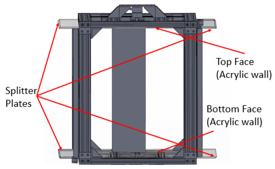 A bespoke 2D wind tunnel insert with a 1 m × 1 m cross-section by 1.2 m-long test section was designed and built. The 2D insert consists of two splitter plates made of 10 mm thick acrylic sheets mounted on square frames and four vertical uprights connecting them and mounting the wing section. This frame is made from extruded aluminium slotted rail sections for ease of assembly and modification. The uprights support the top splitter plate and maintain the 1 m section height. Moreover, the connections at all corners are made of four distinct brackets, each to ensure high rigidity and strength (Figure 20). The bottom splitter plate is mounted to a base frame, where the automatic pitch drive system also sits, through four shorter vertical extrusions that lift the cube-like structure to the centre of the tunnel section (Figure 21). The splitter plates work as walls for the reduced test section where 3D effects are reduced, and a desired quasi-2D flow is produced on a 1 m span. The leading and trailing edges of the splitter plates were cut at a 45° angle to cleanly cleave off a fresh boundary layer. The two sides, which correspond to the walls on the suction and pressure side of the flow, are open, allowing the free expansion of the freestream along the airfoil thickness.
