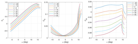 Figure 22 shows a very clean set of data, where each increment in the actuation input angle generates a substantial change in lift coefficient. A maximum is observed in the linear region of the lift curve (i.e., for angles of attack of less than α < 10°), whereas a is observed at around stall. Additionally, it is seen that the point of minimum drag does shift with increasing camber deflections, which is consistent with the results observed by [24]. However, it is worth noting that these drag coefficient results vary significantly with the angle of attack, which is not expected in a 2D wind tunnel test. Two-dimensional drag coefficients should remain relatively unchanged with increasing pitch angle (at a given camber deflection) when the flow is attached (i.e., in the linear region of the lift curve), and then “spike” as the flow starts to separate and stall (see [24] for example). These drag results suggest the presence of 3D effects that standard wind tunnel corrections ([33]) cannot correct. These 3D effects might have been introduced by the 2D insert inside the 7’ × 5’ tunnel section; therefore, they are most likely a limitation of the setup. Despite the lack of high-quality 2D drag measurements, it is interesting and encouraging that the minimum value of drag coefficient for any given morphing deflection is relatively constant, implying that the change in camber is essentially shifting the drag curves left and right by a consistent offset in the angle of attack. Lastly, Figure 23 shows that the FishBAC can be used for controlling pitching moment coefficients. A can be achieved by varying the camber distribution, which highlights the potential that the FishBAC has for use in moment driven control surfaces, such as servo flaps.