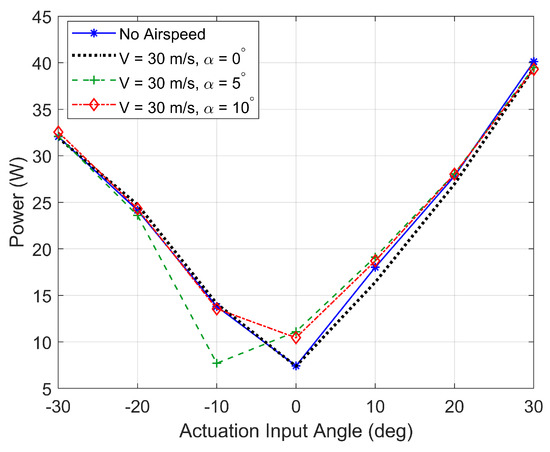 Figure 23 shows the transverse displacements of the trailing edge (spanwise) when the freestream velocity and angle of attack are 30 m s−1 and 0°, respectively. It is observed that the transverse displacements show very similar trends as in when the aerodynamic loads are absent (see Figure 19), which suggests that the achievable displacements are not limited by the amount of torque available, but by the servo’s operating range, which determines the pulley angle rotation at each tendon. Additionally, Figure 24 shows variations in actuator current draw as a function of actuation input angle and at different pitch angles. It is observed in this figure that the power draw does not significantly vary when aerodynamic loads increase, implying that the structural stiffness is significantly more dominant in the overall load than the aerodynamic stiffness.