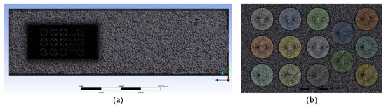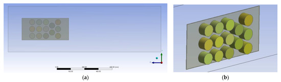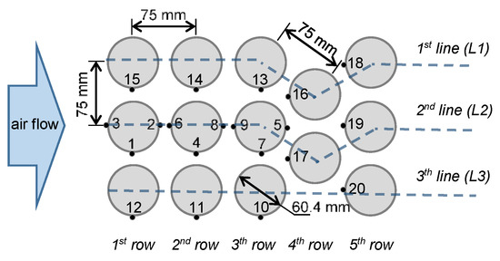 This paper proposes an experimental study completed by a numerical investigation. The experimental study investigates a mixed configuration with five rows (Figure 1). The first three rows are aligned. The last two rows, where the highest temperatures have been found in previous studies [23,24,25,26], are staggered. By going to a staggered configuration for the last two rows, we expect that the thermal transfer coefficient at this location to increase. Thus, the temperature at this place may be lower than if we had kept an aligned arrangement.