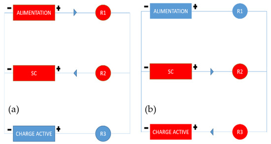 While charging, the flow of the electrical energy passes from the power supply to the SCs (Figure 3a) and when the voltage at the module terminals reaches 37.8 V, the discharge begins. The SCs discharge into the active charge (Figure 3b), which is composed of resistors, until the voltage attains 18.9 V. The relays R1, R2, and R3 are controlled from the LabVIEW program using the output of the NI Card. Depending on the experiment, the charging/discharging current is varied.
