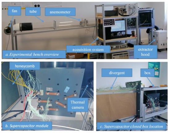 The experimental bench includes (Figure 4): a fan with a variable speed rotation, a tube with a circular cross-section of 20 cm in diameter and with a length of 2 m, a digital anemometer to measure the airflow velocity, a divergent square outlet section 50 × 50 cm2, a honeycomb placed at the outlet of the divergent, a square section box in which the Supercapacitor module is placed, an extractor hood with a variable speed rotation used for air suction from the closed box, and a thermal camera.
