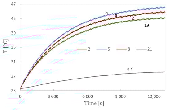 Steady state is assumed for the numerical simulation. For experimental results, the temperature is obtained for t = 1 h, and at that moment, the evolution is asymptotic (Figure 11).