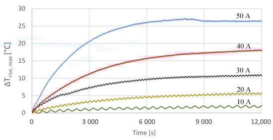 When comparing with Figure 10 (natural convection) a significant decrease is observed in the ΔTrise evolutions, but ΔTmax (i.e., the difference between the highest and the lowest temperature augmentation) is higher than 5 °C if continuous current exceeds 39 A (in natural convection it becomes higher than 5 °C if current exceeds 30 A).