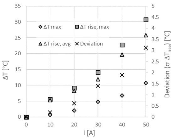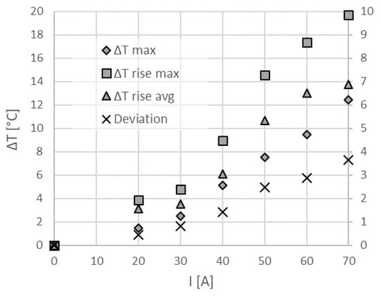The three relative temperatures and deviation values considered before (Equations (8)–(13)) are illustrated in Figure 10. As mentioned before, relative temperatures values increase with the increase of current. This evolution is not a linear curve.
