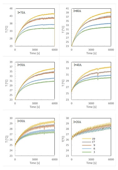The graph of Figure 9 shows the evolution of ΔTrise,max (the maximum temperature augmentation of all of the SCs—Equation (8)) as a function of time for five charges/discharge currents. The higher the charge/discharge current, the higher the maximum temperature reached. The relative temperature reaches 5.5 °C for 20 A and 27 °C for 50 A. The significant thickness of the lines is due to the repetition of the charge/discharge cycles and to the 1 Hz value of acquisition frequency. The time of charging/discharging cycle depends on current rate and varies between 202.5 s for 10 A and 40.5 s for 50 A. The temperature increases during the charge steep and decreasing during the discharge steep. However, the temperature increases everywhere over time during the transient period due to the fact that SCs accumulates heat during each charging/discharging cycle.