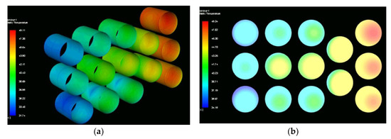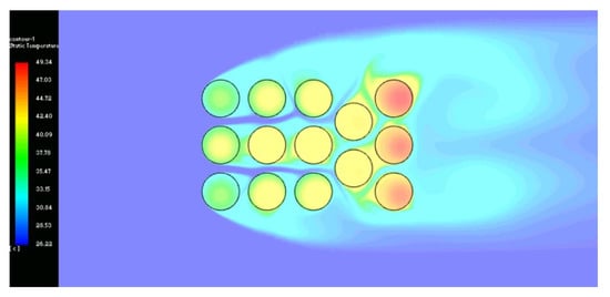 Figure 13 presents the temperature distribution of the supercapacitors on their external surface (Figure 13a) and in the middle longitudinal plan (symmetry plane). The perpendicular plan, which divides each supercapacitor into two equal cylindrical volumes, is chosen since the most important overheating is recorded there. The maximum temperature is located in the middle of SCs around the axis. For the studied case the maximum internal temperature is 49.34 °C. For a full lifespan, SCs are required to maintain temperature below 50 °C [9]. As expected, similar with the experimental study, the temperature increases from the first to the last row.