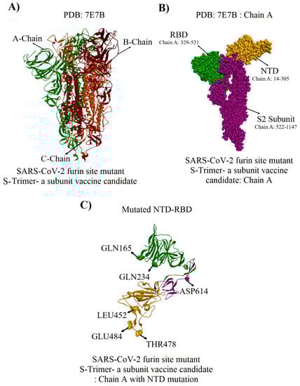 The cryo-electron microscopy structure of the S-Protein trimer, a subunit vaccine candidate for COVID-19 PDB: 7E7B [87], is depicted in Figure 1a, containing chain A, chain B and chain C. Chain A was separated from PDB, and the 7E7B S-Protein trimmer contains the three major units: NTD (14–305), RBD (329–521), and S2 subunit (522–1147), as described in Figure 1b. The structure of the MT-NTD and the mutation in the RBD are pictured in Figure 1c.
