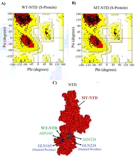 In this study, the NTD domain from PDB: 7E7B was mutated with Asn165Gln and Asn234Gln. No significant conformational change was observed in the structure of the mutant NTD model. Structural evaluation with RAMPAGE showed similar residue numbers in the most favored region (96.81%). Structural alignment and superimposition of wild type (WT-NTD) and mutant type (MT-NTD) (Asn165Gln and Asn234Gln) were performed with the 3D-SS server (http://cluster.physics.iisc.ernet.in/3dss/) (accessed on 26 October 2021) to calculate the disparity in the mutated sites. The superimposed structure was visualized in the Discovery Studio Visualizer v19.1.0.18287 software.