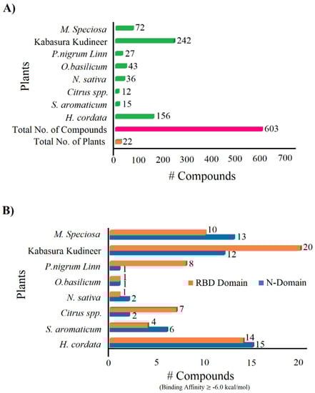 Depiction of the total number of plants, phytocompounds, and the phytocompounds with ≤−6.0kcal/mol binding energy. (A) The total number of plants and phytocompounds utilized in molecular docking study. (B) The number of phytocompounds with the ≤−6.0 kcal/mol binding energy for the further screening process.