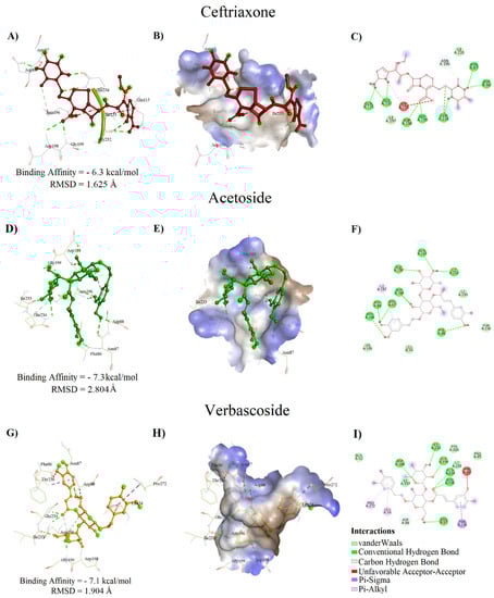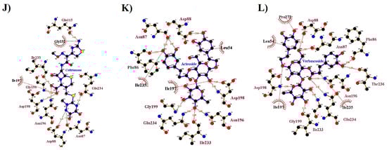 We finally identified the compounds acteoside and verbascoside from C. serratum as acting effectively against the mutated NTD (Figure 4D–I,K,L). The acteoside demonstrated more beneficial interactions with PHE86, ASN87, ASP88, ASN196, ASP198, GLY199, ILE233, and GLN234 via hydrogen bonds with a binding affinity of −7.3 kcal/mol. It also holds alkyl interactions with the ILE197. It is surrounded by hydrophobic residues (LEU54, LYS195, THR236). The toxicity class was also identified as V. The verbascoside interacts with ASN87, ASP88*, ASN196, ASP198, GLY199, ILE233, and GLN234 via carbon–hydrogen* bond with a binding affinity of −7.1 kcal/mol. It also held pi-alkyl interaction with LEU54 and PRO272, as well as pi-sigma bonding with THR236, and was surrounded by the hydrophobic residues (GLN52, PRO85, and ILE235). The predicted toxicity class of verbascoside was V. The standard drug ceftriaxone interacted with ASP88, ASN87, GLN115, ASN156*, ASP198, GLY199, GLY232, GLN234*, and ILE233 by hydrogen, carbon–hydrogen, and pi-alkyl bonds. It was also surrounded by hydrophobic residues ASN196 and ILE197, and the predicted toxicity class was VI. Even though the standard drug ceftriaxone interacted with the crucial residues GLN234* by carbon–hydrogen bond, the binding affinity was −6.3 kcal/mol.