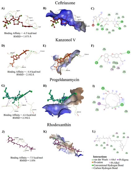 Moreover, the compounds kanzonol V, progeldanamycin, and rhodoxanthin from H. cordata excellently inhibit the RBD domain compared with the other tested phytocompounds (Figure 5D–L,N–P). Kanzonol V strongly interacted with GLU484 and TYR449 by hydrogen bond and showed pi-alkyl interactions with PHE456 and TYR489. Kanzonol V is surrounded by hydrophobic residues LEU452, LEU455, PHE490, and LEU492. The binding affinity is −6.8 kcal/mol. It belonged to the toxicity classes of V. Progeldanamycin has hydrogen bond interactions with TYR449, and SER494, as well as pi-sigma interaction with LEU452, and is also surrounded by the hydrophobic residues ASN450, PHE490, LEU492, and GLN493. The observed binding affinity is −6.4 kcal/mol with the toxicity class IV. Rhodoxanthin shows pi-alkyl interactions with LEU452, TYR489, and PHE490 and was surrounded by the hydrophobic residues ARG346, SER349, TYR351, ASN450, LEU455, PHE456, GLU484, GLY485, PHE486, LEU492, GLN493, and SER494 with the binding affinity of −7.5 kcal/mol. The toxicity class was noticed as VI. However, the ceftriaxone did not interact with the specifically defined residues L452R, T478K, and E484Q in the Indian delta variant, and the binding affinity was observed as −6.5 kcal/mol.