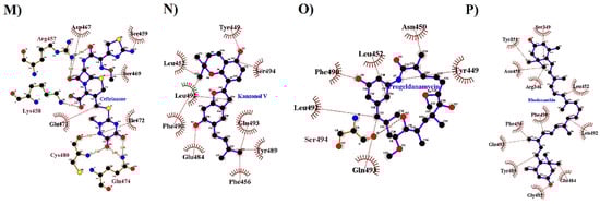 The docking pose of the RBD with the most promising phytocompounds based on the binding affinity and interacting residues (A,D,G,J). The docking poses with ceftriaxone, kanzonol V, progeldanamycin and rhodoxanthin (B,E,H,K). The hydrophobicity of the interacting residues (brown (↑ hydrophobicity)-blue (↓ hydrophobicity), (C,F,I,L). The type of bonds involved in interacting phytocompounds with RBD residues (M–P). The LigPlot interaction for the phytocompounds docked with RBD residues.