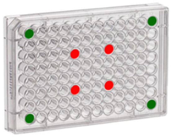 The figure shows the positioning of the control spheroids (green) and of those that will be treated (red). The probe beam is 16 mm in diameter so two wells are sufficient to avoid overlapping of effects.