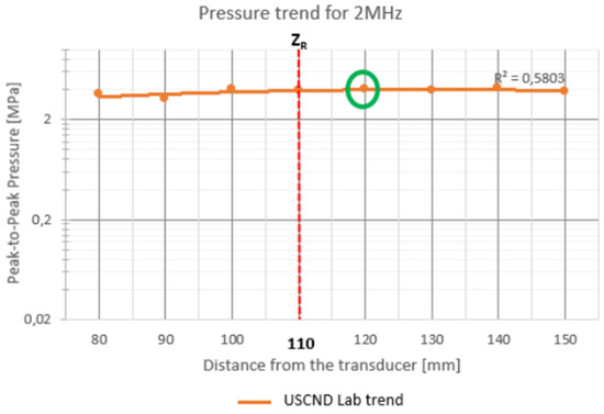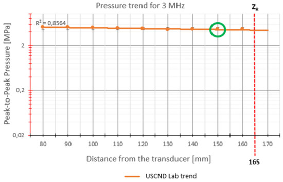 For 3 MHz stimulation (Figure 6), the points measured by the hydrophone are located in the near field, in fact ZR = 165 mm. The only point that is positioned around the Rayleigh distance is 150 mm, chosen as the optimal stimulation point.