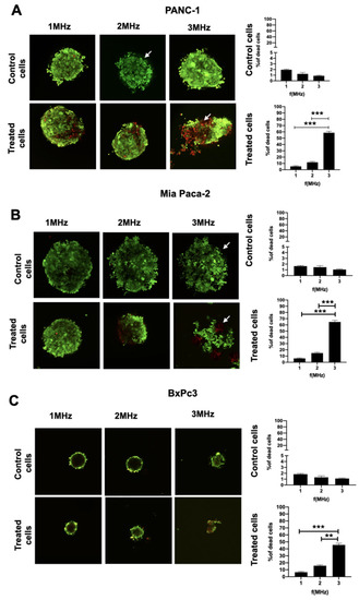 Images acquired with Confocal fluorescence microscope SP8 confocal microscope (Leica), showing PDAC cell spheroids. (A) PANC-1 spheroids, control upper panel and treated lower panel with 1, 2 and 3 MHz. In each well one spheroid was seeded, and images were acquired at 10× magnification. Control cells appear stained in green, which represents viable cells (see white arrows); while treated cells show a marked spotted red staining (see white arrow), which represent dead cells. Quantification of viable and dead cells using the BioFilmAnalyzer software is also reported. (B) Mia Paca-2 spheroids, control cells upper panel and treated cells lower panel, with 1, 2 and 3 MHz. In each well one spheroid was seeded, and images were acquired at 10× magnification. Control cells appear with a predominant green staining (see white arrow), indicating viable cells; while treated spheroids appear smaller and with a prevalence of red staining dots, indicating cell death (see white arrows). Mia Paca-2 spheroids, treated with 3 MHz frequency, also appear to disaggregate. Quantification of viable and dead cells using Spheroid Sizer (Mathlab) is also reported. (C) BxPc3 spheroids, control upper panel and treated lower panel with 1, 2 and 3 MHz. In each well one spheroid was seeded, and images were acquired at 10× magnification. Control cells appear stained in green, which represents viable cells (see white arrows); while treated cells show a marked spotted red staining. BxPc3 spheroids appear smaller, as per proper cell characteristics. Cell staining appears concentrated on the spheroid margins, as they are compact and have less dye permeable. Quantification of viable and dead cells using Spheroid Sizer (Mathlab) is also reported. Image size for all pictures: 900 × 900 µm, acquired under 10× magnification. *** p < 0.001;** p < 0.01.