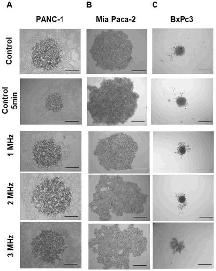 Brightfield images of PANC-1, Mia Paca 2 and BxPc3. (A) PANC-1 images of spheroids, control (untreated cells), control after 5 min (Control 5 min) of stimulation, cells treated with 1 MHz, 2 MHz and 3 MHz. (B) Mia Paca 2 images of spheroids, control (untreated cells), control after 5 min (Control 5 min) of stimulation, cells treated with 1 MHz, 2 MHz and 3 MHz. (C) BxPc3 images of spheroids, control (untreated cells), control after 5 min (Control 5 min) of stimulation, cells treated with 1 MHz, 2 MHz and 3 MHz (scale bar: 100 µm).