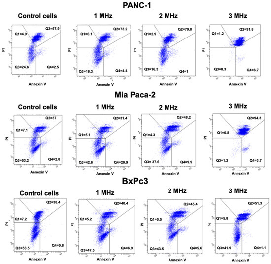 In particular, PANC-1 cells show 91.8% of treated cells in Q2 (late apoptosis) compared to 67.9% of Control cells. Mia Paca-2 treated cells have 94.3% of cells in Q2, compared to 37% of Control cells. Finally, BxPc3 has 51.3% of cells in Q2 compared to 38.4% of control cells. A lower effect, but in consistence with the trend, was envisaged in cells treated at lower frequencies, as reported in Figure 9.