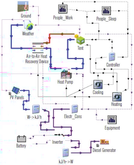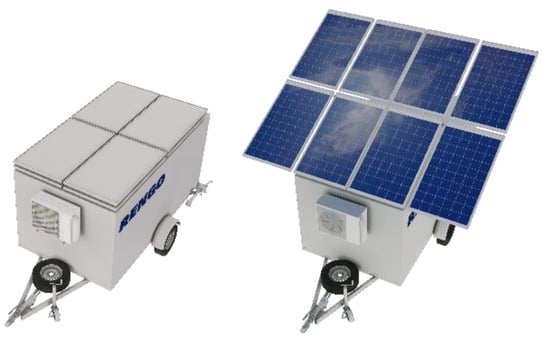 The developed mobile energy generation unit described in this paper consists of eight photovoltaic (PV) batteries for power generation connected to an inverter and electricity storage battery. The generated electricity is converted by a heat pump to heat or cool air for the heating/conditioning supply of temporary structures. Exhaust air heat recovery devices are used to increase the overall efficiency of the system and to ensure the adequate air hygiene and occupants’ comfort in temporary shelters. Heat recovery is an integral part of modern energy efficient HVAC systems [29,30]. As an auxiliary source of energy generation (in case there is not enough solar resources), a diesel generator is provided to extend the autonomy of mobile energy generation unit. The operation control of the mobile energy generation unit is implemented by energy management controller connected via the Internet that can be operated remotely. The visualization, scheme and technical characteristics of the mobile energy generation unit are shown in Figure 1 and Figure 2 and Table 2.
