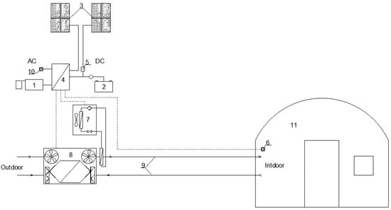 The scheme of the mobile energy generation unit: 1—diesel generator; 2—electricity storage battery; 3—PV panels; 4—inverter; 5—controller; 6—electricity consumers’ power connector; 7—heat pump; 8—air-to-air heat recovery device; 9—air supply/exhaust channels; 10—connection to the power supply; 11—shelter.