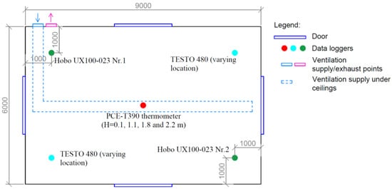 The mobile energy generation unit has been tested in real conditions in Riga, Latvia, for a year. On the campus of the Riga Technical University, the conditions of the temporary shelter were recreated—a tent was set up and a mobile energy generation unit was connected to it (see Figure 3), and the laboratory staff performed the measurements in the tent at in different seasons and times of the day. For the accuracy of the experiment, various electrical devices were connected and the number of people varied from zero to five. Various air temperature sensors and TESTO 480 comfort probes were installed inside the tent to measure the temperature; humidity and indoor air quality (see Figure 4). Technical characteristics of the mobile energy generation unit are described in Table 2.
