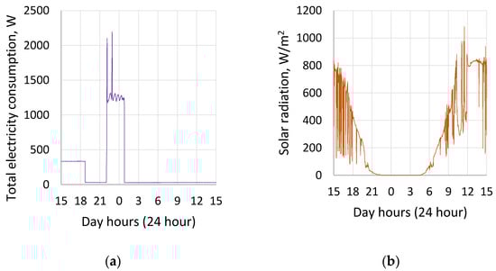 In our case the most important factor is climate conditions, because the energy generation unit is mobile, therefore the factors, such as the current lighting of the PV and angle of inclination of the PV, can be easily adjusted, and the unit can be easily cleaned of dirt and dust. The average solar radiation in Northern Europe is 1.1 kWh/m2. For the simulated cases see Table 5 (data obtained from the “Global Solar Atlas 2.0”—a free, web-based application is developed and operated by the company Solargis s.r.o. on behalf of the World Bank Group, utilizing Solargis data, with funding provided by the Energy Sector Management Assistance Program (ESMAP). For additional information: https://globalsolaratlas.info (accessed on 26 November 2021) [32]).