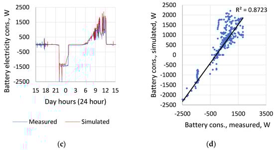 A digital TRNSYS model was validated based on real measurements carried out during mobile energy unit operation (see Figure 6). A mobile energy unit ensured data logging with 1 min interval. For the validation, solar radiation on the horizontal surface [W/m2] and total electricity consumption [W] from 22 June 2021 15:00 till 23 June 2021 15:00 was used. During this period the diesel generator was switched off. At the start, the battery was fully charged (100%). The power injected to the battery translates into a positive energy balance, while the power going from the battery translates into a negative energy balance.