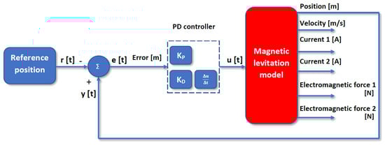 The considered object of magnetic levitation constitutes a laboratory device; it works based on a dedicated proportional–differential PD controller used for both the real system and its model. Due to the nature of the plant operation in the EMS technology (falling ball in an electromagnetic field), it was assumed that the feedback value entering the summation node is positive, while the reference signal is negative. This approach is attractive in order to obtain the positive values of proportional and differential elements [19,20]. It should be emphasized that the levitation process device is related to the multivariable plant (Figure 2); thus, the position of the ball is assumed as the operating point. As we will see, the presented PD controller has some drawbacks, so the optimal control structures are still required.