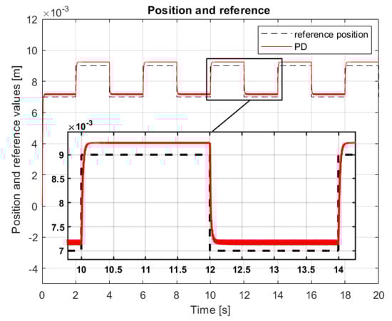 In this part, the PD-originated results derived from the scheme of Figure 2 are discussed. The reference signal is related to the position of the levitating ball located in the following meter scale range = <>, calculated from the upper electromagnetic base—the position is changing in every 2 s. After applying the engineering method, we obtain the crucial parameters = 1500 and = 40 along with the time domain plots depicted in Figure 3. Although the dynamic behavior of the closed-loop control system is rather impressive—a time needed to obtain the reference values is equal to 200 ms, the steady-state error is certainly occurred. According to the factory device without an integral action, the reference error covers the range = <> in the meter scale.