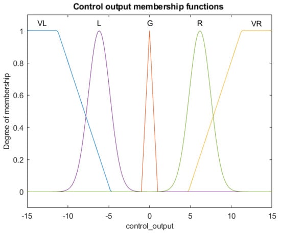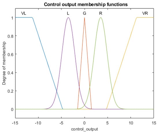 During selection of the linguistic variables, the different membership functions have been utilized. It has been assumed that two functions, i.e., so-called triangular and trapezoidal, would describe two input signals. The reason is that discussed functions are quite easy under the implementation process and their parameters are intuitive as well as simple to interpret. However, it should also be noted that these functions are sharp—the property can change their values and derivatives rapidly. Indeed, as a consequence, the continuous derivative behavior is omitted here [22,23]. The output-related fuzzy sets have been subjected to the defuzzification process according to the Gaussian distribution as follows [23]