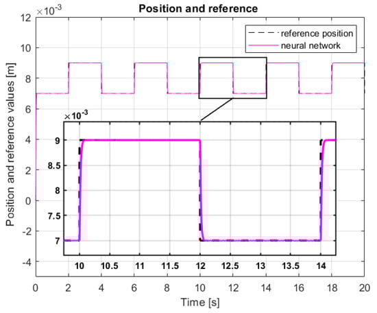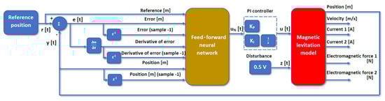 In order to present the validity of resulted control scheme, an additional disturbance has been implemented. The reason is that we would like to know whether the network is overtrained—in such a case, the generalization behavior could be lost. As the disturbance , the DC voltage equal to 0.5 V has been given on the lower electromagnet (see Figure 9).