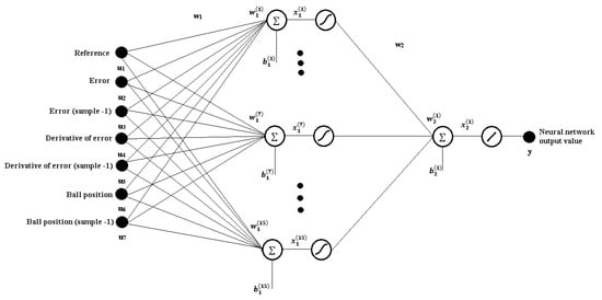 In this section, near to the earlier presented solutions, the advanced neural network approach is investigated. Therefore, in order to approximate the nonlinear continuous-time function according to the theorem of Kolmogorov and Cybenko, the neural network has been examined, which consists of the nonlinear neurons in the first layer and linear neurons in the second one [24,25]. Naturally, a number of nonlinear neurons should be proper in the context of providing an accurate behavior of the objective neural network scheme. Regarding the assumed structure of the control system as in the Figure 9, the simulation study has involved two network layers with one nonlinear hidden layer and single linear output layer. A number of neurons located in the hidden layer have been calculated according to the following formula