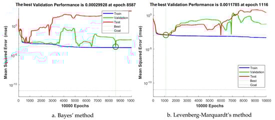 At the beginning of this section, it should be emphasized that two gradient-related methods have been compared under research studies, i.e., Levenberg–Marquardt (trainlm(.)) and Bayes (trainbr(.)) approaches—two offered by the MATLAB environment. In the former solution, the approximated Hessian matrix of the network error function is calculated using its gradient and some regularization factor. One of the main advantages of the discussed method is a convergence. Moreover, in the case of this approach, the limitation of the classical Newton’s algorithm does not occur. Therefore, it is one of the best methods of the small and medium neural networks training [29,30]. On the other hand, the Bayes approach can train any network that meets the following conditions: weight and input data as well as the transfer function are differentiable functions [29,31,32].