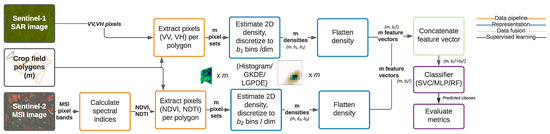 We consider a fixed-dimensional representation suitable as an input for any classifier, where the are center points of elements (bins) in an equally spaced grid G overlaid on the density’s support dimensions (pixel bands), so that G has B discretization intervals in each of the D dimensions, with a total of elements. is a probability density that we learn based on the object’s pixel collection X and then evaluate the density at the points of G to form the representation. We consider only cases with , where the channels are two SAR polarisations or the two vegetation indices for MSI, so that we can directly model the joint density. For higher-dimensional cases, an alternative approach is to estimate a marginal density for each channel separately and evaluate it along a grid of B elements, resulting in a representation for each band separately. A combined representation can then be obtained by concatenating these as .
