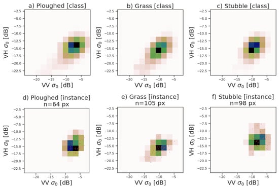 Gaussian kernel density estimate representations of polarimetric SAR intensity measurements for ploughed, grass- and stubble-covered fields. (a–c): Class-level density estimates from a large random sample of all pixels of all field parcels of a class. (d–f): Density estimates for single parcels of each class. The small red dots indicate individual pixels, with small jitter so multiple pixels with identical values are also visible.