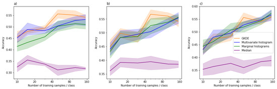 Figure 5 reports the accuracy for varying sizes of training data for three different classifiers. The main observations for our MSI dataset are: (i) All forms of density estimates outperform naive summary statistics. The baseline of using an aggregate summary of all pixels, the median of NDVI and NDTI values, barely beats the random baseline of 33% classification accuracy, whereas all density estimates achieve accuracies between 40% and 60% depending on the case; (ii) direct multivariate estimates are at least as good as histograms and for some cases (SVC) better; (iii) GKDE performs as well as the multivariate histogram and sometimes (SVC and MLP for some training set sizes) marginally better. In summary, the results show that proper density estimators were preferable over both multivariate and marginal histograms as general representations. Even though there was no clear difference for one of the classifiers (RF), there were no cases where using GKDE would hurt.