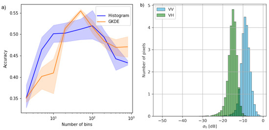 Choice of the discretization bins. (a) Accuracy as function of the number of bins for S2 MSI data. (b) S1 SAR intensity (sigma nought, ) in crop field pixels concentrate within bounds of −30...0 dB.
