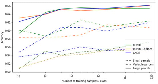 We compare three proper density estimators, GKDE and LGPDE, with two inference algorithms (MCMC and Laplace approximation) and restrict to a single choice of the classifier to streamline the results; the observations are similar for the other classifiers. Figure 7 shows the accuracies for these estimators as function of the size of the training data for three scenarios: small parcels that only uses parcels of pixels for training and evaluation, large parcels that only uses parcels of pixels for training and evalution, and variable parcels that uses both small and larger parcels (range of px). The main results are: (i) The problem is considerably easier if the objects are larger but already for the small parcels of only tens of pixels we comfortably beat the random baseline; (ii) The accuracy naturally improves when we get more training instances, but already relatively small number of approximately 30 parcels per class is enough for good accuracy; (iii) The representations are robust over parcels of varying size, shown by relatively high accuracy for the case that contains both small and large parcels; (iv) There are no clear differences between the three density estimators in terms of accuracy.