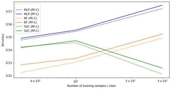 Even though we did not observe a direct improvement in classification accuracy for the more advanced density estimator LGPDE, it has the advantage of explicitly modeling the uncertainty of the estimate and we can propagate it through the classification process for any classifier as explained in Section 2.2.2. To demonstrate this, Figure 8 shows the classification accuracy for the three different classifiers for a dataset of small parcels ( px), for both PE-C and PP-C. We observe that the PP-C approach that models the uncertainty offers a small but consistent improvement. Figure 9 shows that the resulting class probability distributions behave as expected—for small fields the uncertainty is better captured in the final class distributions.