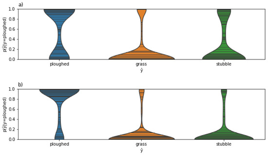Confidence of small (a) vs. large (b) ploughed fields being classified as ploughed from a probabilistic perspective, with higher uncertainty for small fields, as expected.