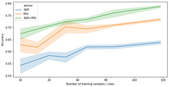 By learning separate representations for each image modality (capture method or sensor) , we can perform easy data integration by simply concatenating the representations . In experiments Section 3.1.1 and Section 3.1.2 we showed that both MSI and SAR are valuable sources of information for this task, and Figure 10 shows that by further combining them we get a significant improvement in overall accuracy: The combined solution outperforms MSI, which has the higher accuracy of the single-source capturing methods, on average by approximately 8 percentage points. We show the results on 1500 test parcels for the MLP classifier; the other classifiers followed a similar pattern.
