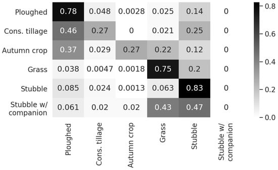 Regarding mislabeling, the reference data were prepared with automatic rule-based labeling, which is inherently error-prone. Whereas contradictory examples (duplicates) can be removed, mislabeling remains a practical challenge due to inevitable simplifications when building the rules. Imperfections in the underlying information on agricultural practices imply that each class membership has different reliability. For example, planting of autumn crop is explicitly declared by the farmer, thus having really high reliability, whereas ploughing is merely inferred by applying a long classifying set of rules to the information. Conservation tillage is an example of low reliability. Farmers explicitly declare to apply conservation tillage in October as it is subsidized, but if weather conditions are not suitable for tilling after the declaration date, fields may remain covered by vegetation. As vegetation cover is considered the more sustainable option, “no-till” is not subject to a penalty. As a result, probability of stubble field samples mislabeled as conservation tillage is high.