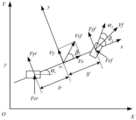 where and are the cornering stiffnesses of the front and rear tires, respectively. Since there are two front and rear wheels, the force is twice that of a single tire. and are the tire sideslip angle and the angle between the direction of the tire velocity vector and the x axis, respectively. At a small angle, the size of the two angles can be approximately expressed as: