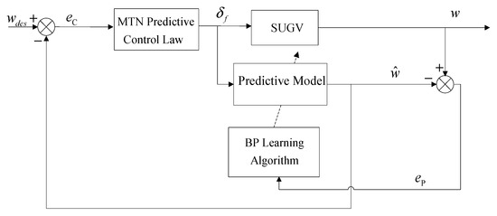 An improved predictive control scheme on the basis of the MTN is proposed for tracking control of SUGVs. First, a predictive model is constructed as follows: (1) the MTN is used as a predictive model to construct a SUGV model; and (2) the BP algorithm is used as its learning algorithm. Second, a predictive control law is designed to control the SUGV. The frame diagram of the improved MTN predictive control system is shown in Figure 3. The front wheel steering angle is used as the control input, which is equivalent to the mentioned above. The yaw velocity is used as the system output, which is equivalent to the mentioned above. The predictive model output is equivalent to the mentioned above. The desired yaw velocity is used as the system input, which is equivalent to the mentioned above.