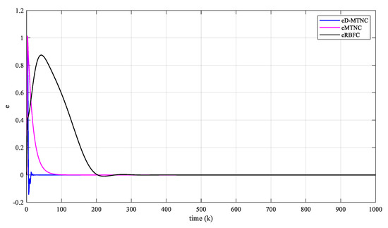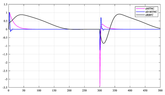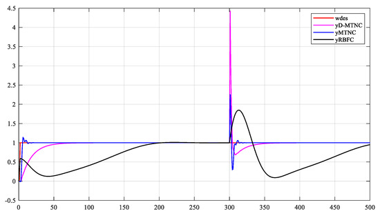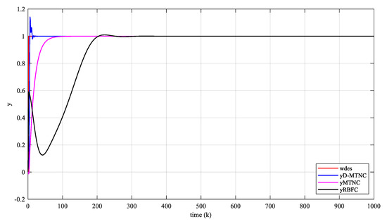In the following figures, wdes represents the given reference signal; yMTNC is the traditional MTN predictive control scheme; yD-MTNC is the proposed predictive control scheme; yRBFC is the RBF model predictive control scheme; and eMTNC, eD-MTNC, and eRBFC represent the corresponding tracking errors.