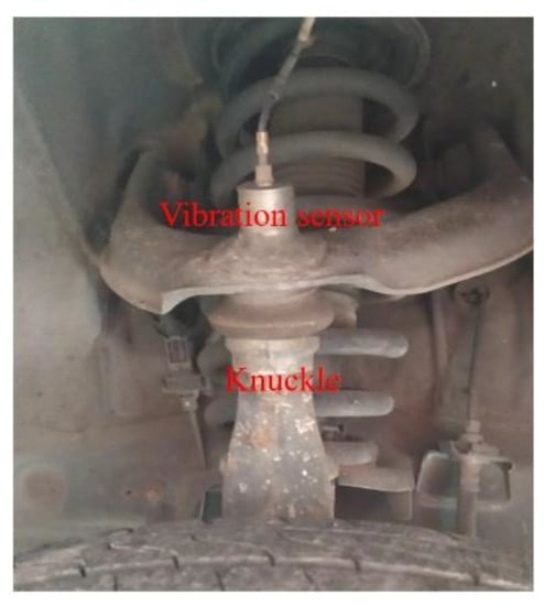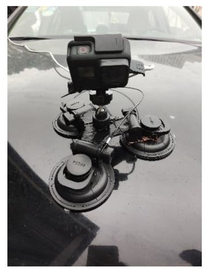The test equipment included a test car, a vibration sensor, a constant current adapter, a data acquisition card, and a laptop computer. For the placement position, some studies simply place the sensors on the vehicle floor, seat, or center console for ease of installation. Still, these locations are far away from where the tires and the pavement are in contact and have passed the vibration damping system; therefore, the vibration is relatively small and less sensitive. In this study, the vibration sensor was installed on the knuckle of the right front wheel, which is not subjected to the vibration damping system and thus is more sensitive to pavement conditions. The sensor position is shown in Figure 2. A motion camera was used to record the surface condition of the testing pavement, which was installed on the hood, as shown in Figure 3.